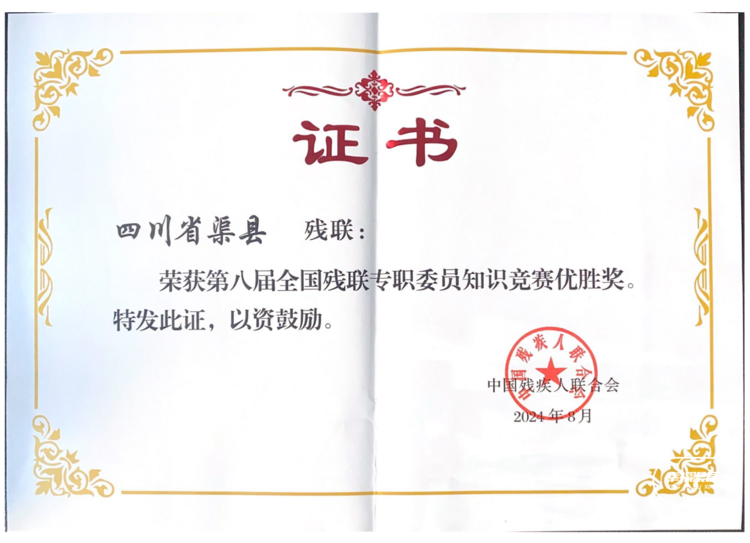 培训结束后,大家积极参加了由中国残联主办的“2024 第八届全国残联专职委员知识竞赛”。经过激烈角逐,渠县荣获县级优胜奖。这一成绩的取得,充分展示了渠县残疾人工作者扎实的专业知识和积极向上的精神风貌。