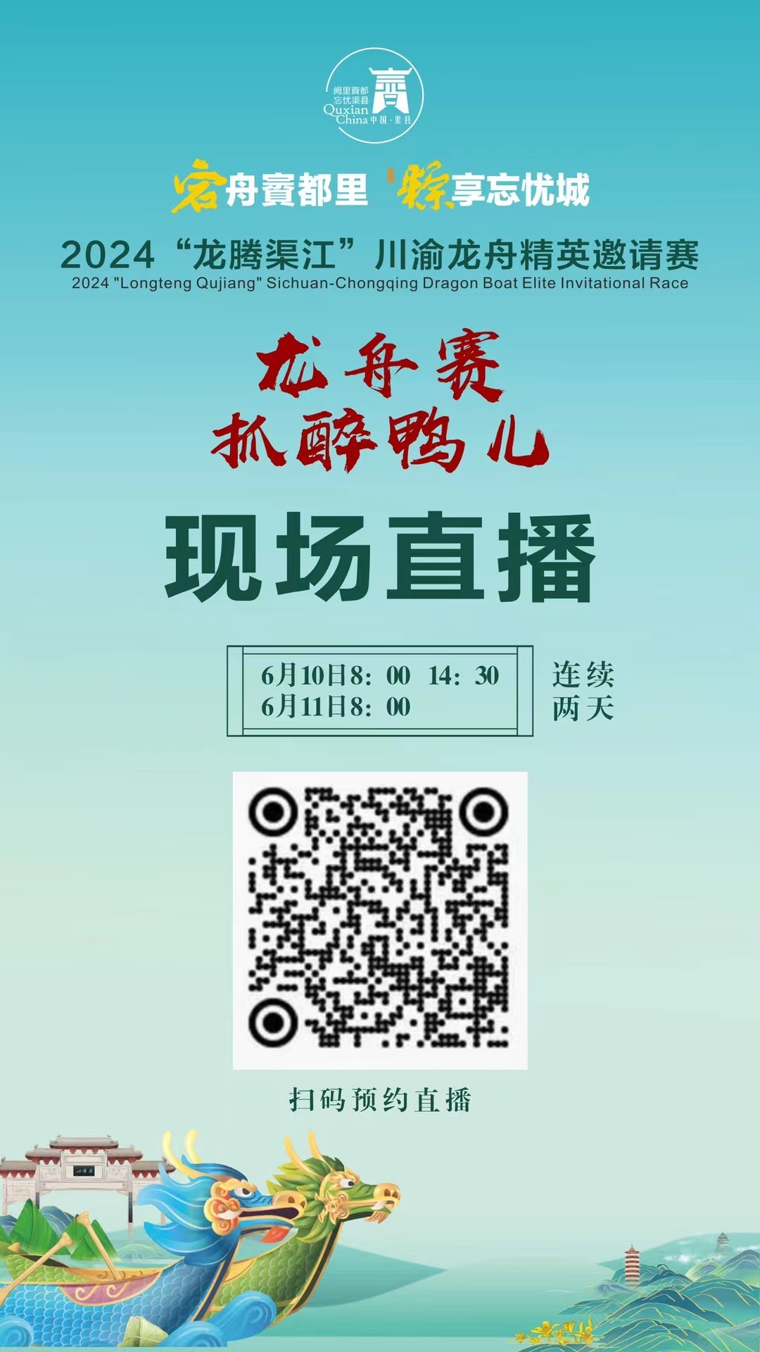2024年6月10日 上午8:00--11:00举行龙舟赛启动仪式,进行预赛;